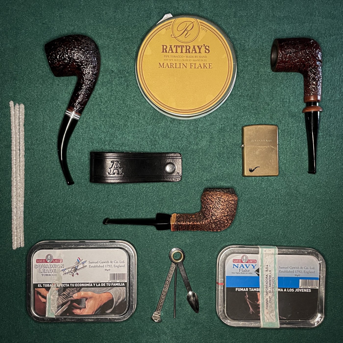 En mi kit diario pipero, estos son los items que siempre estan presentes. Los tabacos, van rotando, pero un virginia y un latakiado, siempre estan a mi lado.