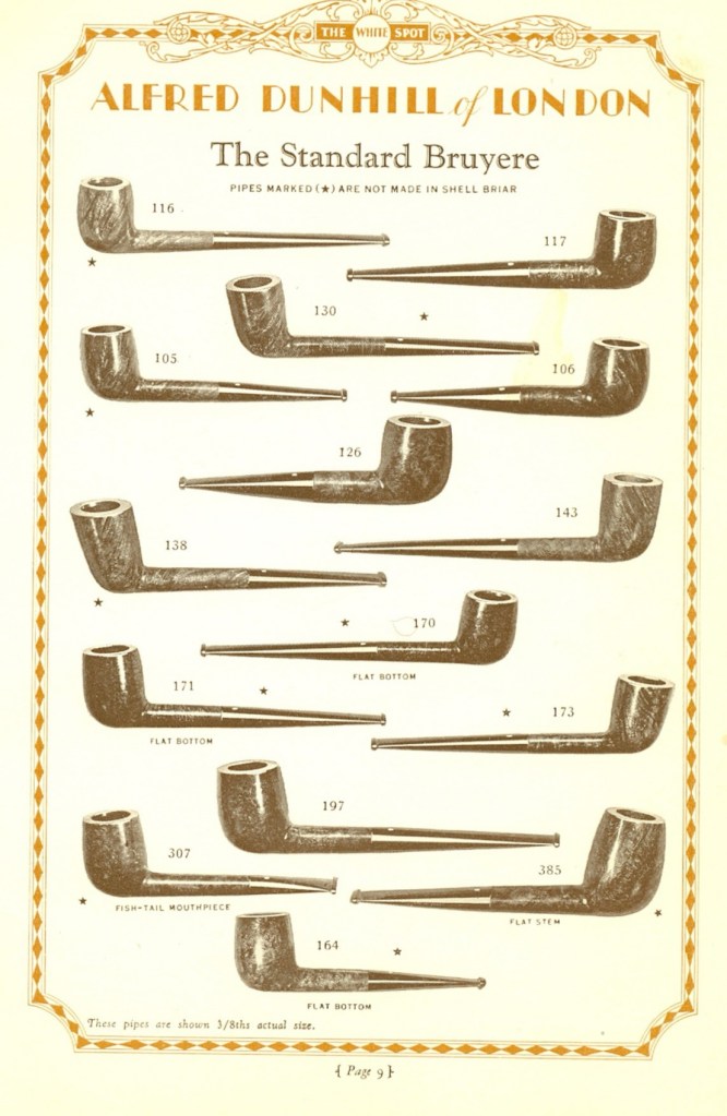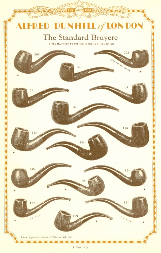 Estos arquetipos se desarrollaron en una época en la que la veta del brezo no era una prioridad en la fabricación de pipas. Como se mencionó anteriormente, en el siglo XIX y principios del XX, la prioridad era la producción en masa. Las pipas se consideraban instrumentos prácticos para disfrutar del tabaco, y su atractivo estético no era tan fundamental en el proceso de fabricación de las fábricas como lo sería posteriormente. Consideremos, por ejemplo, los primeros acabados de pipas: el acabado Bruyere de Dunhill , si bien ofrecía una paleta de colores hermosa y elegante, nunca tuvo como objetivo resaltar las vetas naturales del brezo, y los primeros ejemplares del acabado arenado Shell Briar presentaban una textura densa y desigual en lugar de acentuar intencionalmente los anillos de crecimiento. Esto no significa que esas primeras pipas carecieran de belleza intrínseca; simplemente, el atractivo estético y la veta no eran prioritarios al comienzo de la fabricación de pipas de brezo.